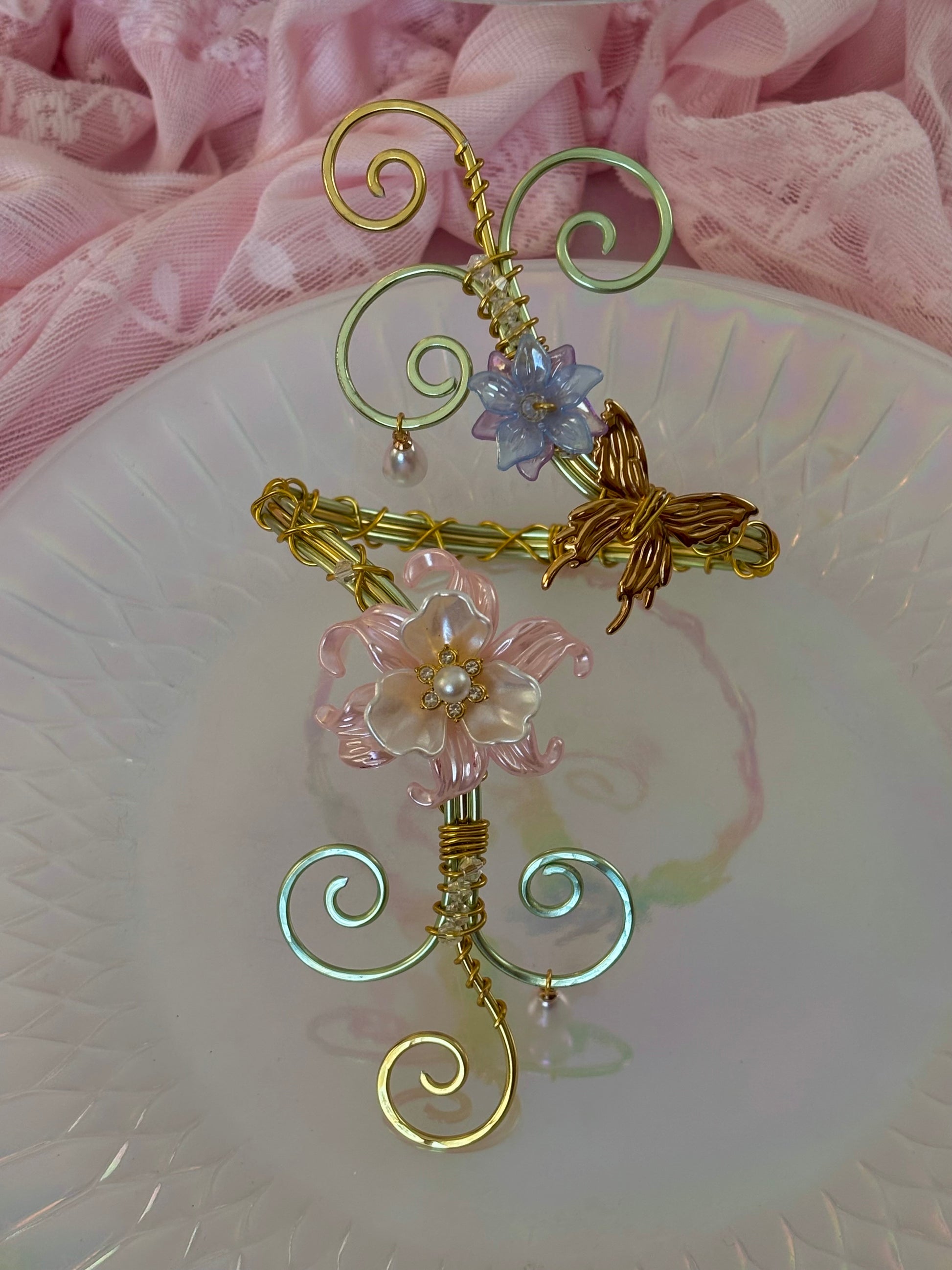 one of a kind, handmade arm cuff with 14k gold plated wire, czech glass beads, flower beads, faux peal droplets, and a stainless steel butterfly <3