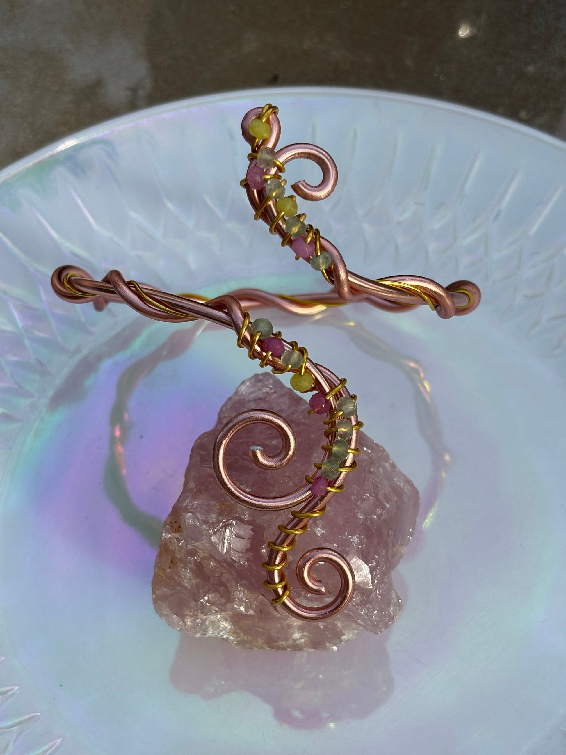 one of a kind, handmade arm cuff with rose gold plated wire, lemon jade and pink and green tourmaline <3
